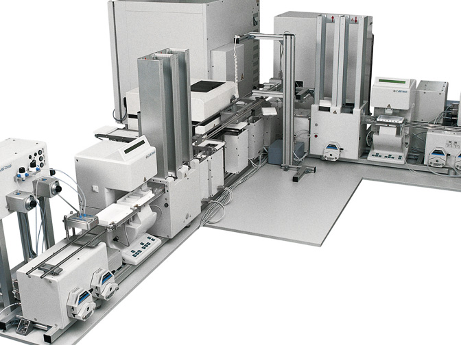 The flexible concept of the CyBio®Screen-machine enables high and ultra high throughput screening of biochemical and cell-based assays. A patented transport system connects liquid handling units, stackers, incubators and fluorescence or luminescence readers.