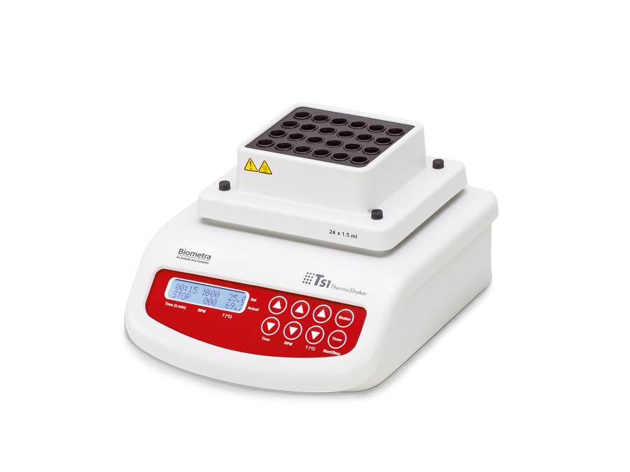 The ThermoShaker TS1 is a variable speed and variable temperature microtube shaking incubator. Combining the incubation phase with mixing has multiple benefi ts: reduction of reaction process times, reduction of operator‘s workload and increasing efficiency of many procedures (e. g. transformation of bacterial cells).